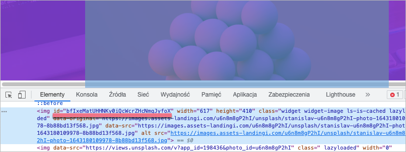 3b. W panelu deweloperskim zobaczysz numer ID elementu po parametrze id=.
