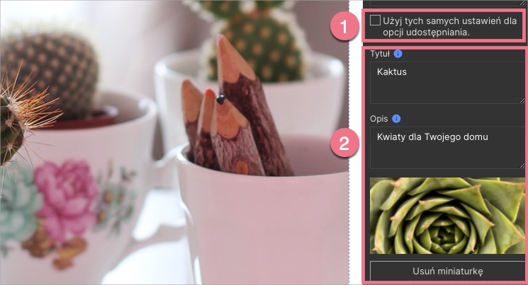 3. Możesz wybrać opcję Użyj tych samych ustawień dla opcji udostępniania (1), a tytuł i opis będą takie same dla wyników wyszukiwania (np. w Google) i platform społecznościowych, lub możesz dodać inny tytuł i opis. Załaduj miniaturkę (2).
