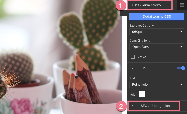 2. Przejdź do panelu po prawej stronie edytora. Opcje SEO (2) znajdziesz w zakładce Ustawienia strony (1).