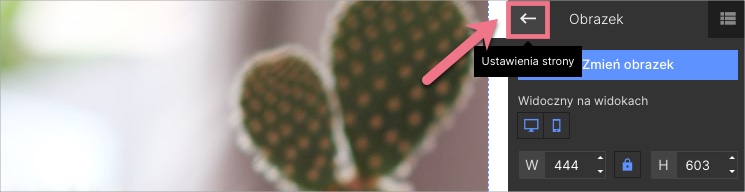W trakcie edycji możesz wrócić do Ustawień strony, klikając w strzałkę: