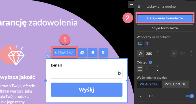 2. Kliknij w formularz i wejdź w Ustawienia z menu podręcznego (1) lub panelu bocznego (2).