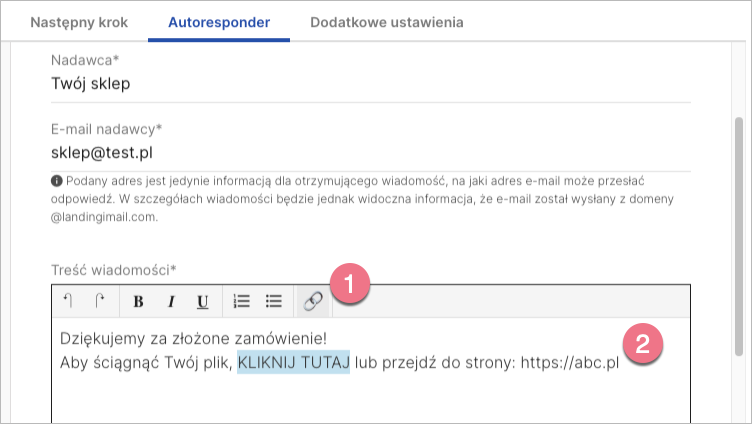 3. Przejdź do zakładki Autoresponder i wypełnij pola. Możesz dodać hiperłącze do tekstu (1) lub w treści wiadomości umieścić link do pobrania pliku (2). Na koniec kliknij Zapisz i zamknij.