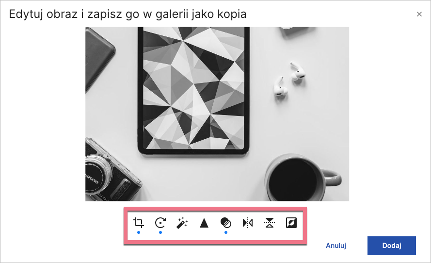 2. W opcji Edytuj obraz pod obrazkiem znajdziesz wszystkie podstawowe opcje edycji obrazów. Po zakończeniu edycji kliknij Dodaj.