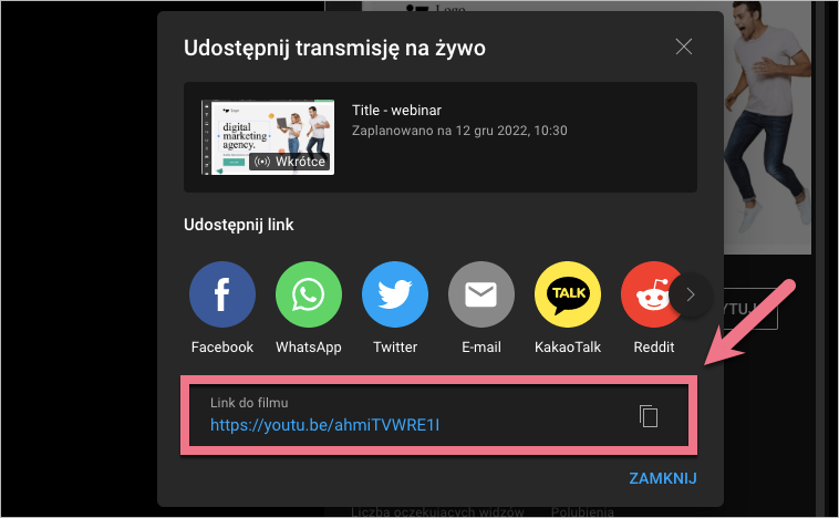 WSKAZÓWKA: Jeżeli chcesz, aby transmisja była niepubliczna, stwórz ją, skopiuj jej link, a następnie zmień adres z https://www.youtube.com/live/11xx… na https://www.youtube.com/watch?v=11xx… Zmieniony adres wklej w miejscu wskazanym w punkcie 5.