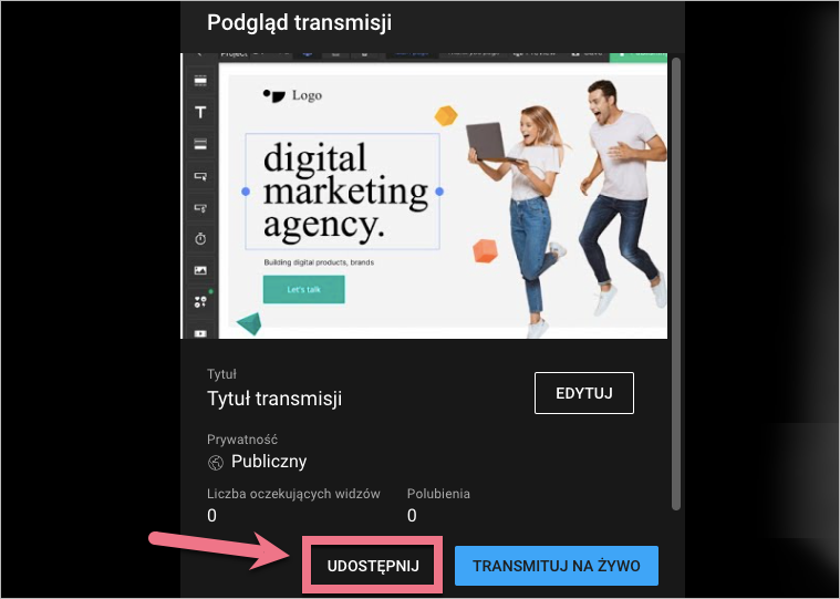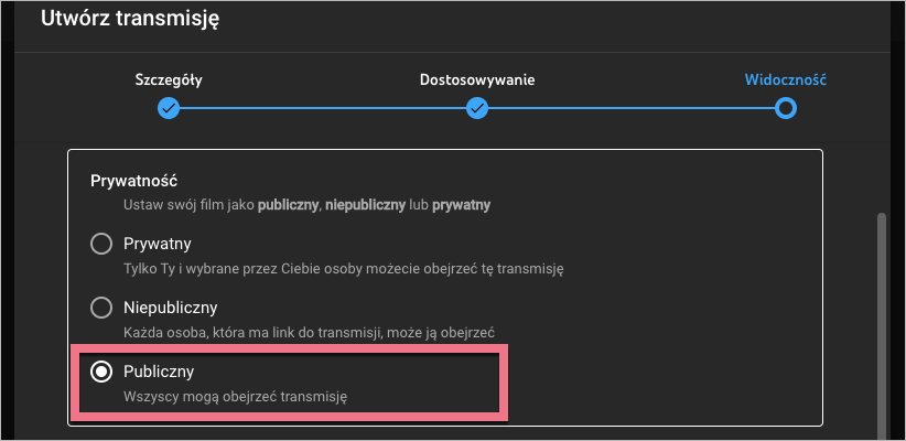 2. Podczas konfiguracji transmisji oznacz film jako publiczny.