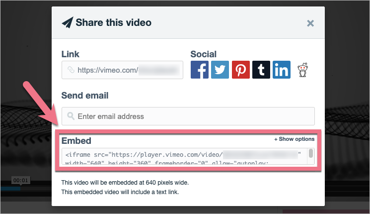 Aby zmienić szerokość i wysokość filmu, kliknij Show options.