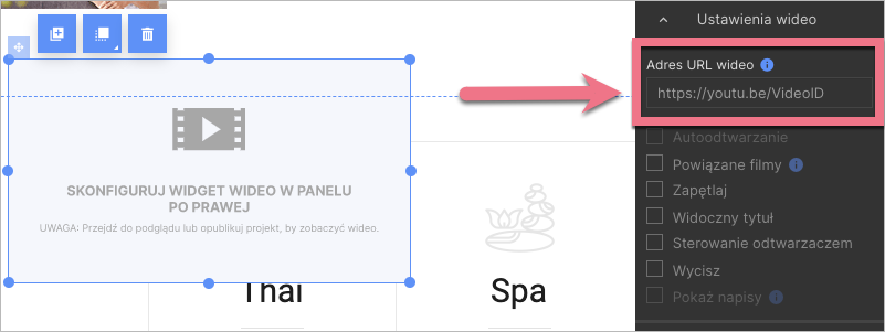 3. W panelu po prawej stronie odnajdź zakładkę Ustawienia wideo i w polu Adres URL wideo wklej ścieżkę URL swojego filmu.
