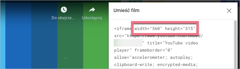 Możesz zmienić szerokość (width) i wysokość (height) filmu: