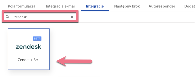 3. W zakładce Integracje wybierz Zendesk Sell. Wpisz nazwę integracji w wyszukiwarce i kliknij enter.
