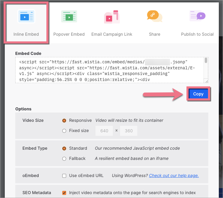 4. Skopiuj kod z zakładki Inline Embed. W razie potrzeby możesz dostosować opcje osadzania filmu.
