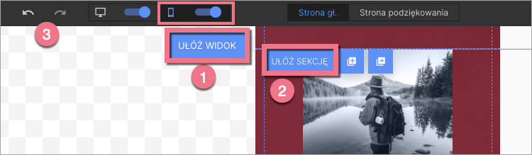 Domyślnym widokiem w edytorze jest widok desktopowy. Widok mobilny jest ściśle powiązany z podziałem landing page’a na sekcje, dlatego planowanie widoku mobilnego musisz zacząć już na etapie projektowania landing page’a. Widok mobilny możesz włączyć w każdym momencie – wszystkie wcześniej użyte elementy zostaną do niego automatycznie załadowane.