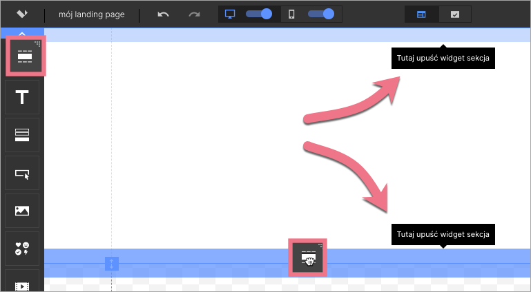 1. Po lewej stronie edytora odszukaj widget Sekcja, następnie przeciągnij go i upuść w obszar aktywny Twojego landing page’a.