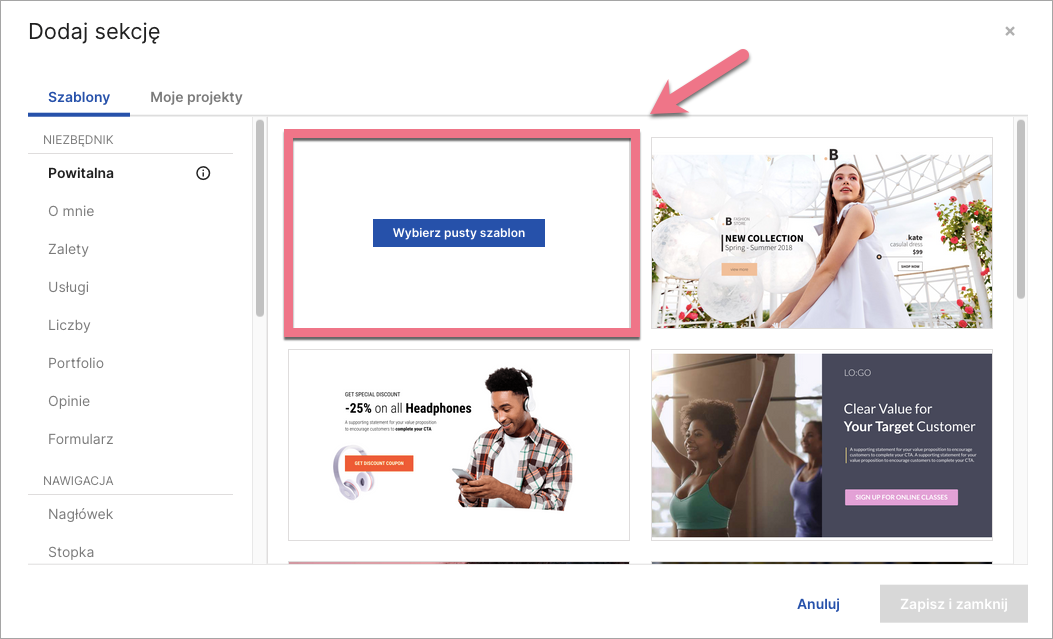 2a. W oknie Dodaj sekcję najedź kursorem na Wybierz pusty szablon.