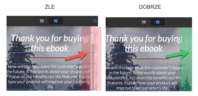 7. Niebieskie obramowanie elementu (linia ciągła) nie powinno wychodzić poza obszar roboczy edytora (pionowa linia przerywana). Obramowanie elementu wychodzące poza obszar roboczy powoduje problemy z wyświetlaniem landing page’a na urządzeniach mobilnych.