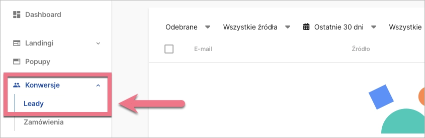 Przejdź do zakładki Landingi, wybierz landing page i kliknij Leady. Przejdziesz do zakładki Leady, ale tylko z leadami dla tej konkretnej strony. Statystyki leadów oraz współczynnik konwersji możesz podejrzeć z poziomu Dashboardu danego landing page’a.