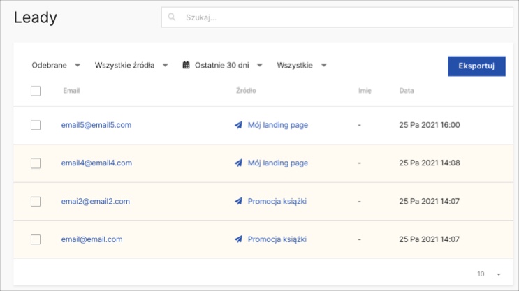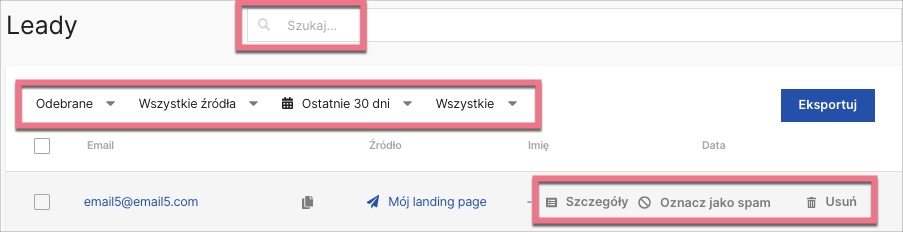 W zakładce znajdziesz listę wszystkich swoich leadów zebranych na landing page’ach (i lightboxach) oraz pop-upach. Podświetlone leady to leady nieodczytane.