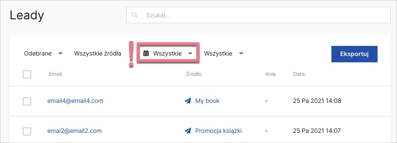 Wybranie zakresu dat Wszystkie i kliknięcie Eksportuj spowoduje eksport leadów tylko z ostatnich 30 dni.