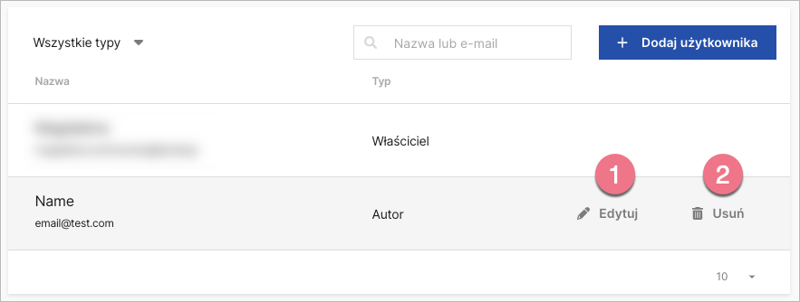 Z poziomu zakładki Użytkownicy możesz zarządzać swoimi użytkownikami: dodawać nowych, edytować (1) lub usuwać obecnych (2).