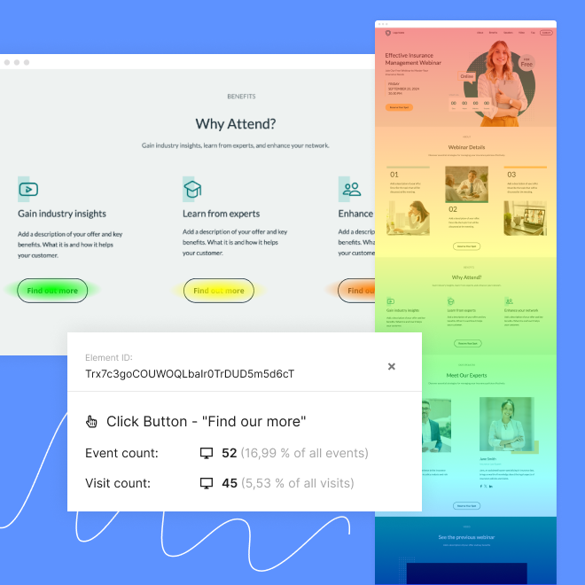 See how users interact with your page—which buttons they click and how deeply they scroll. A heatmap allows you to quickly assess the effectiveness of your page layout and the visibility of key elements.