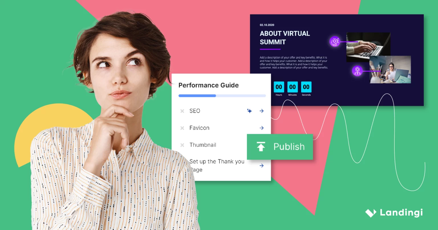 - Antes de publicar, use o Landingi’s Performance Guide para otimizar sua página.