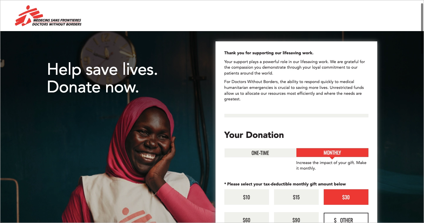 O objetivo dos Doctors Without Borders é fornecer assistência médica imparcial às pessoas afetadas por conflitos, epidemias, desastres ou exclusão de cuidados de saúde, independentemente de raça, religião ou afiliação política. A landing page dessa organização enfatiza a urgência da ajuda médica em zonas de crise, usando cenários da vida real para pedir apoio.