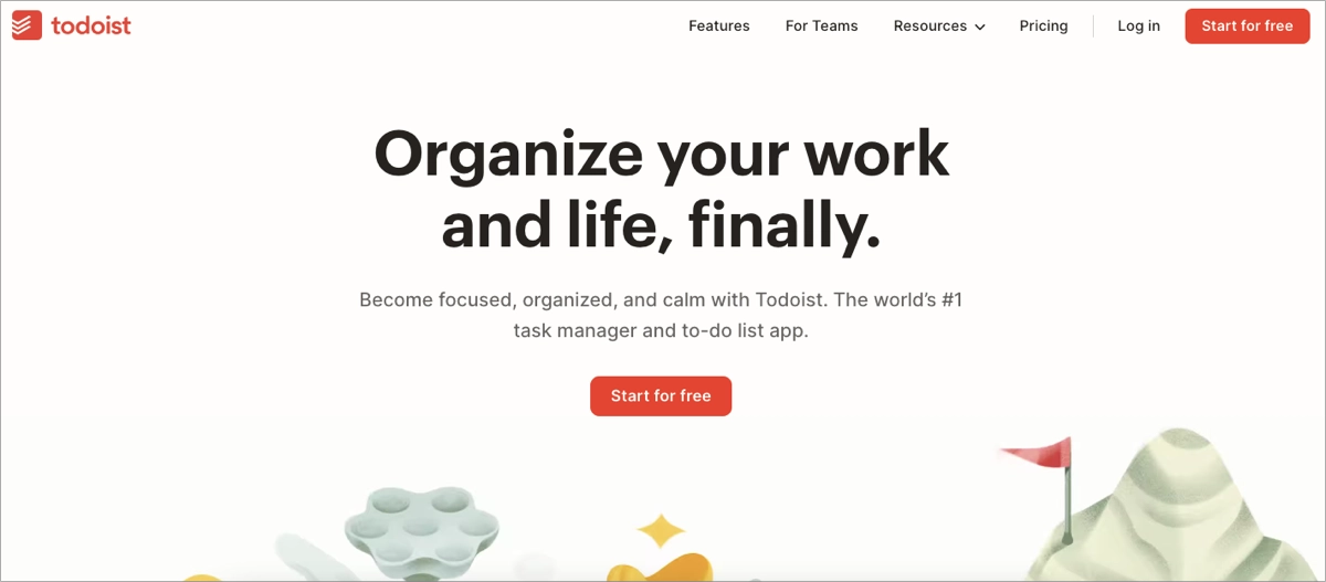 A landing page apresenta o Todoist como uma ferramenta que pode lidar com uma ampla gama de projetos, desde listas de compras pessoais até projetos de TI de milhões de dólares, demonstrando sua escalabilidade. Ainda assim, o design da landing page é simples e mantido em uma convenção clara – ele não apenas simplifica a navegação, mas também faz referência à funcionalidade do produto. Eles implementaram elementos interativos e animações que demonstram recursos básicos e avançados.