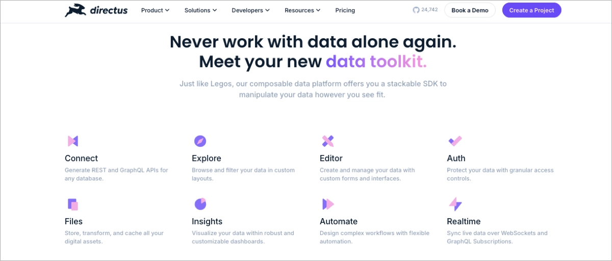A landing page da Directus apresenta sua plataforma de dados de código aberto com um design arrojado, elementos interativos e uma lista abrangente de recursos. A landing page apresenta um guia sobre a criação de módulos de landing page personalizados no ecossistema Directus , fornecendo uma plataforma flexível para que os desenvolvedores criem soluções personalizadas.