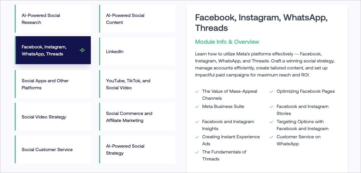 The program is divided into six modules that guide you from the basics of social strategy to using Meta Ads Manager and measuring performance across platforms like Facebook, Instagram, and Messenger.