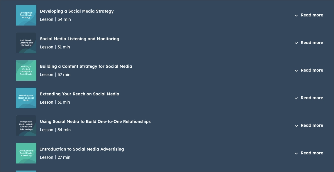 The HubSpot Social Media Marketing Certification is one of the best free courses available for beginners looking to build a strong foundation in social media marketing. With 10 concise lessons and over 5 hours of content, the course walks you through key concepts like: