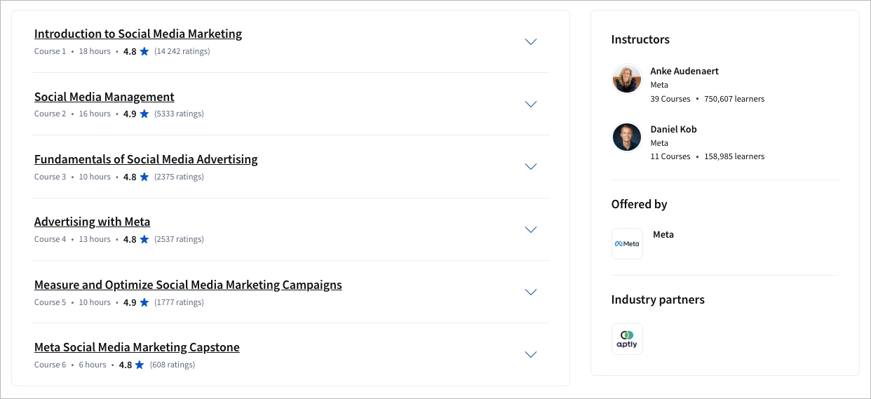 This beginner-friendly course from Meta is one of the most popular social media certifications on Coursera. It covers the full range of essential skills, including content creation, paid advertising, and campaign analysis.