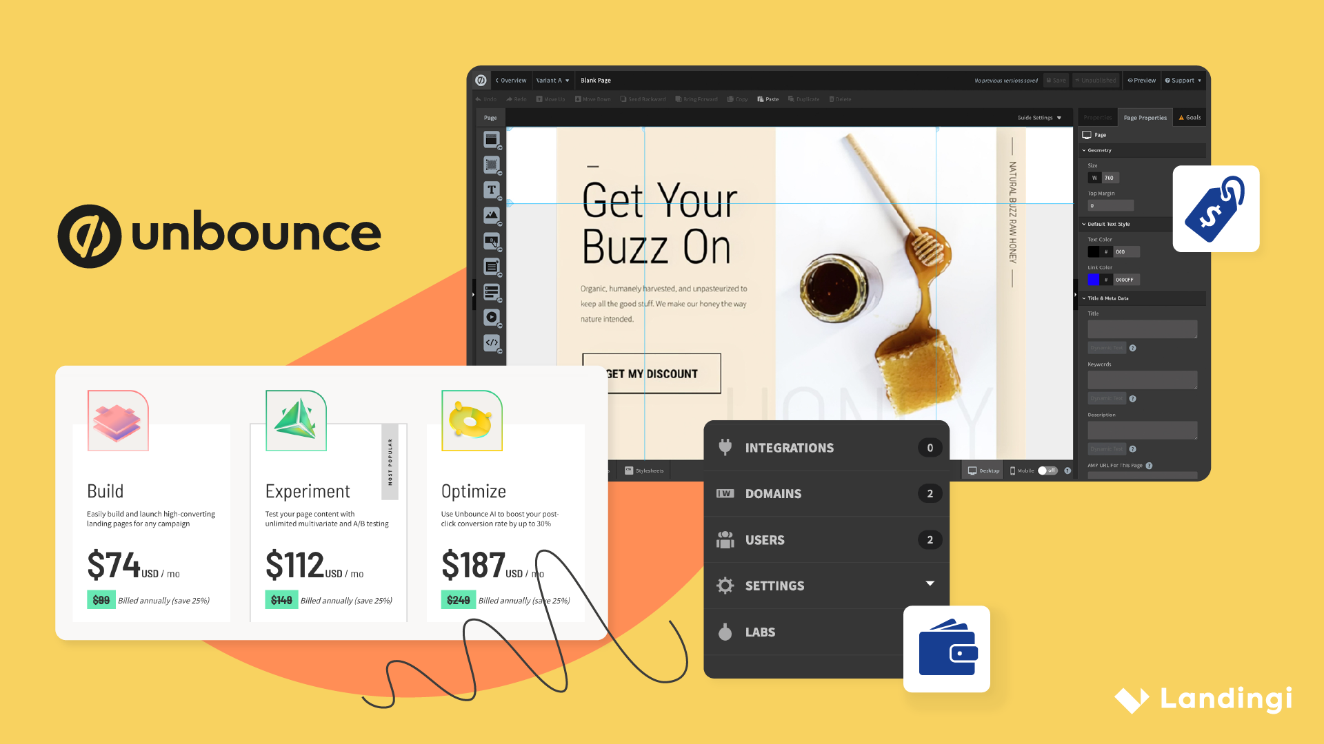 Unbounce pricing includes 4 plans: “Build” for $74 USD/mo, “Experiment” for $112 USD/mo, “Optimize” for $187 USD/mo, and “Agency” for $649 USD/mo. If you prefer to pay annually, prices increase to $99, $149, $249 and custom per month, respectively. Basic plan is dedicated to one-man brands and small businesses, “Experiment” and “Optimize” are perfect for agencies, start-ups or mid-level companies, while “Agency” may be an ideal match for global corporations and big firms.